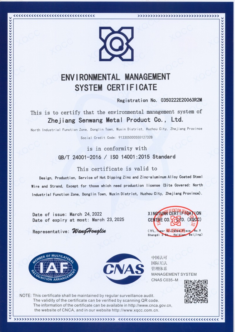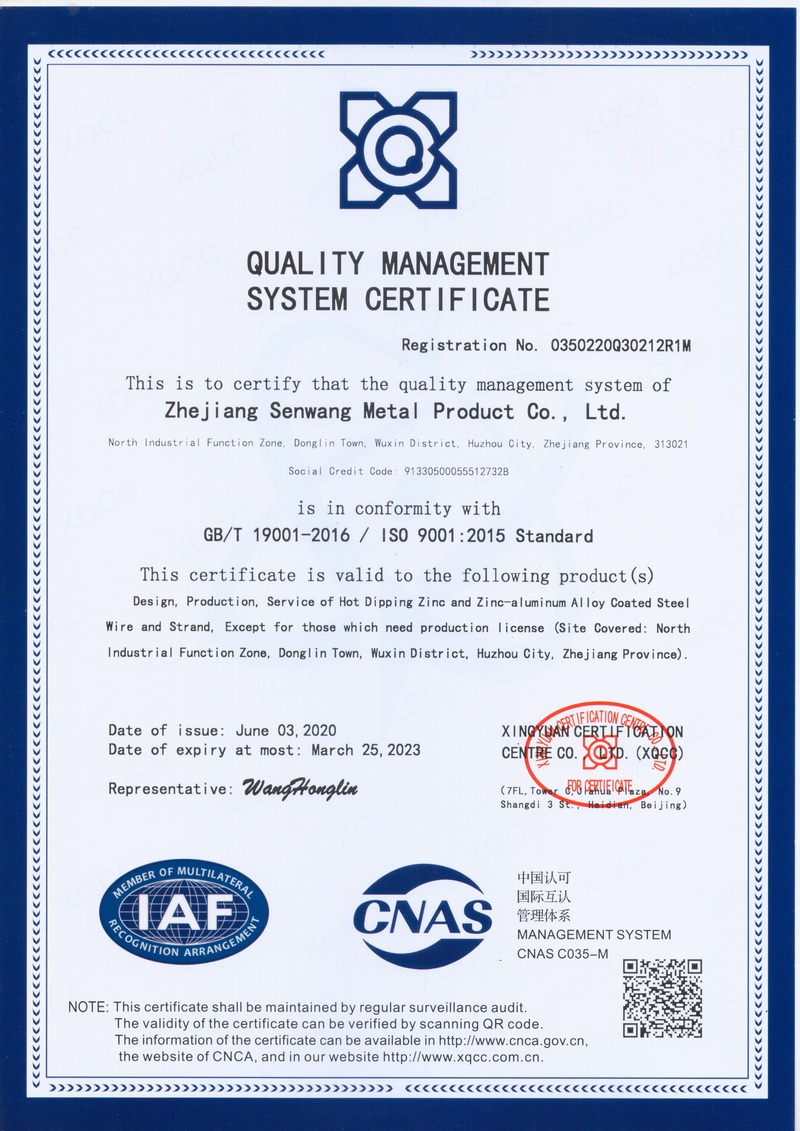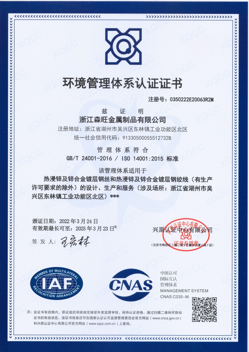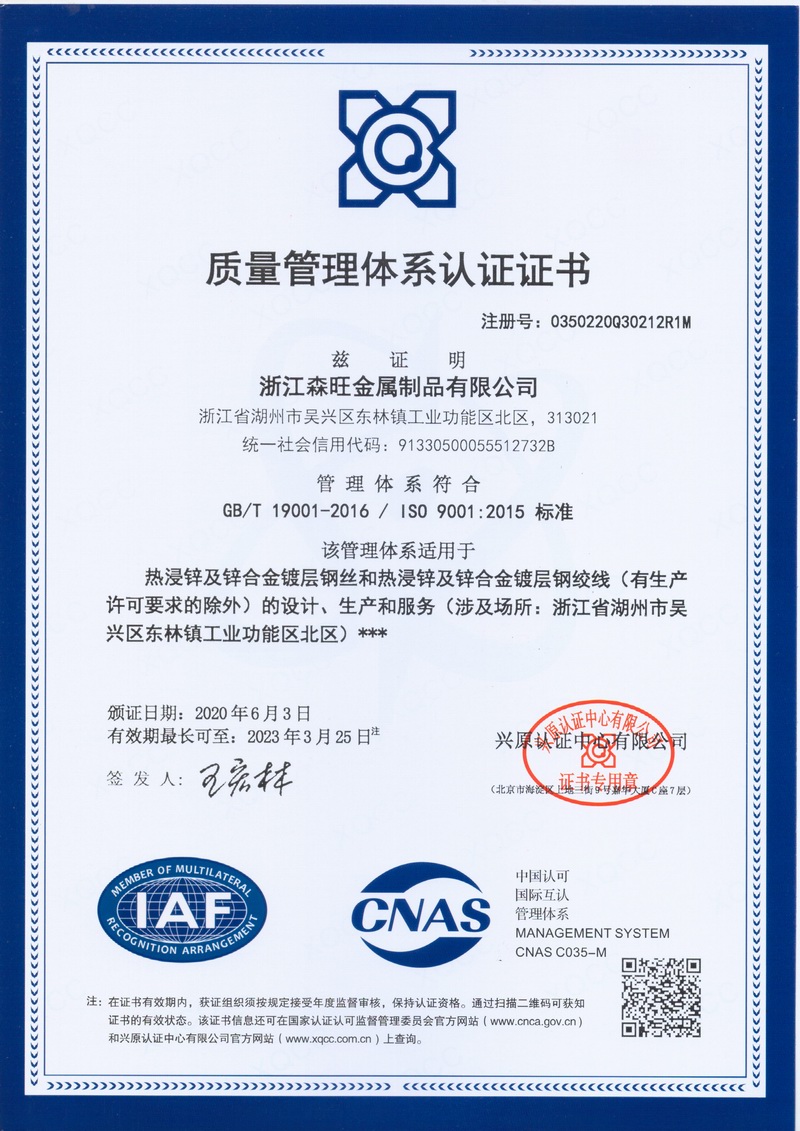 浙江森旺金屬制品有限公司成立于2012年,坐落湖州市吳興區(qū)東林鎮(zhèn)工業(yè)功能區(qū)。公司專(zhuān)業(yè)從事各類(lèi)鍍鋅鋼絲、鋼絞線(xiàn)等產(chǎn)品的開(kāi)發(fā)及生產(chǎn)。目前產(chǎn)品已廣泛應(yīng)用于各類(lèi)通信光電纜,電力輸送,電氣化鐵路工程,各類(lèi)堤壩防護(hù)及農(nóng)業(yè)溫室等工程領(lǐng)域。公司秉承“追求卓越品質(zhì),創(chuàng)建卓著信譽(yù)”的經(jīng)營(yíng)理念,始終堅(jiān)持專(zhuān)業(yè)化、規(guī)模化的經(jīng)營(yíng)模式。